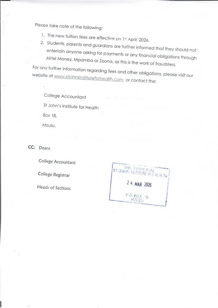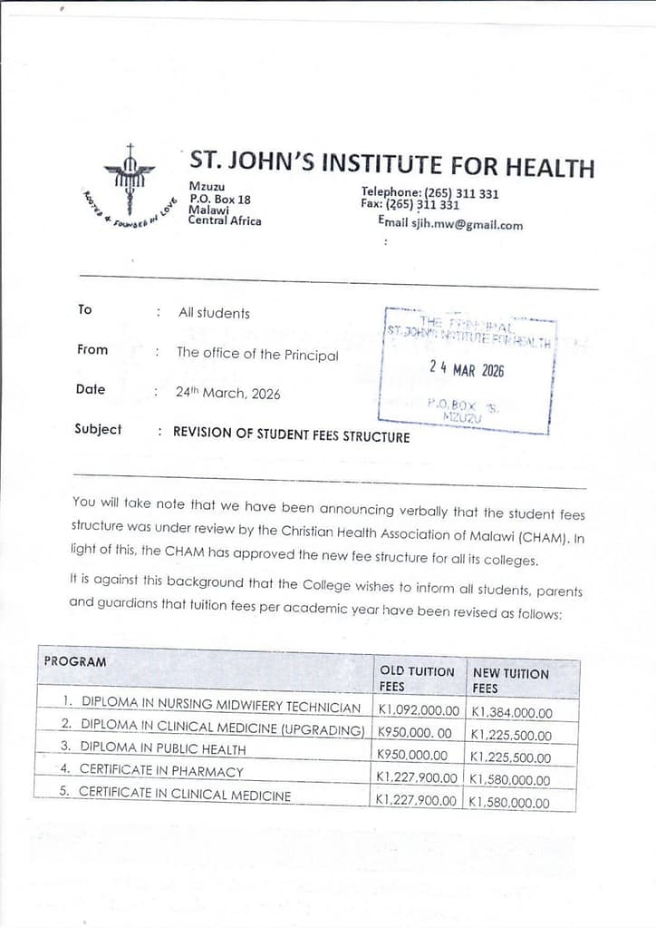 St John’s Institute for Health is pleased to announce the names of successful candidates who have been selected to pursue various programs for the 2026 May Intakes, tenable at its Mzuzu campus.